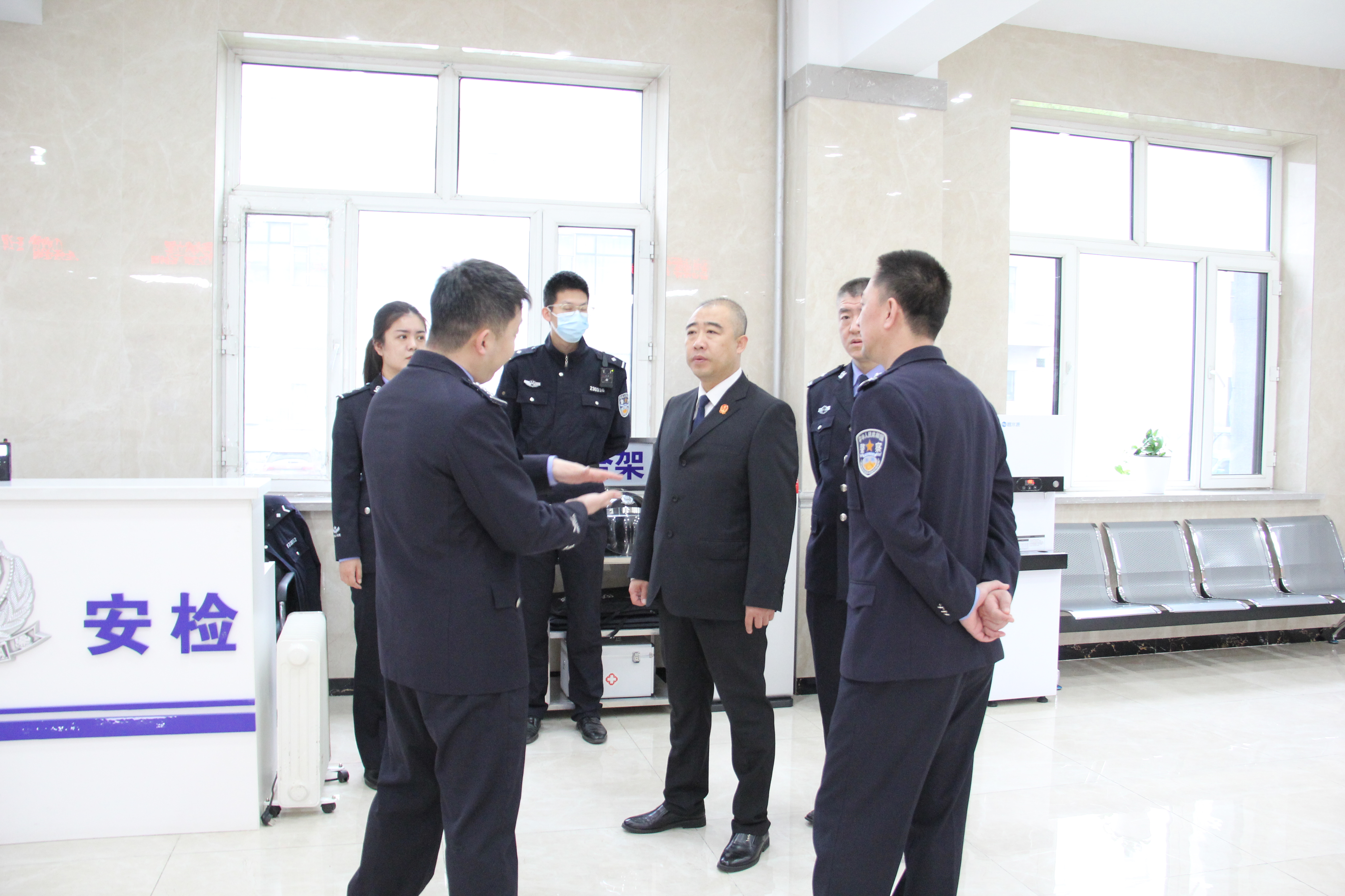 周英超一行先后对办公大楼、诉讼服务中心、刑事审判法庭进行检查,详细检查了警用装备及药品配置、值班备勤和安检门岗等工作情况,并对X射线检测仪、储物柜、执法记录仪、对讲机等装备进行逐一检查。法警队长朱万里详细介绍了门岗安检流程及疫情防控工作情况。